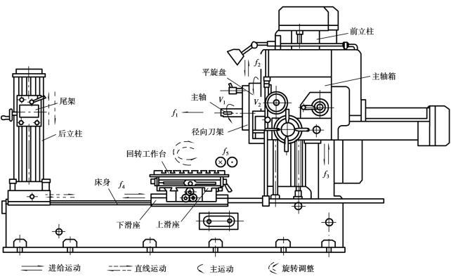 平旋盤如圖5.2.35所示,其安裝在主軸外邊,可作旋轉主運動V2。上面裝有徑向刀架,刀具可沿徑向導軌作徑向進給運動f2。
