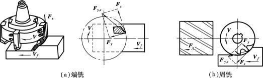 銑削過程中的總切削力F分解為3個相互垂直的分力,即切向力F z、徑向力F y和軸向力F x,如圖5.2.61所示。F z是作用在銑刀外圓切線方向的分力,可用來大致計算消耗在銑削過程中的功率;F x是作用在銑床主軸上的軸向力,可用來估算主軸軸向受力大小;Fy是作用在主軸上的徑向力。F y與F z的合力F y,z作用在銑刀刀軸上,使刀軸產生彎曲變形,影響加工精度。