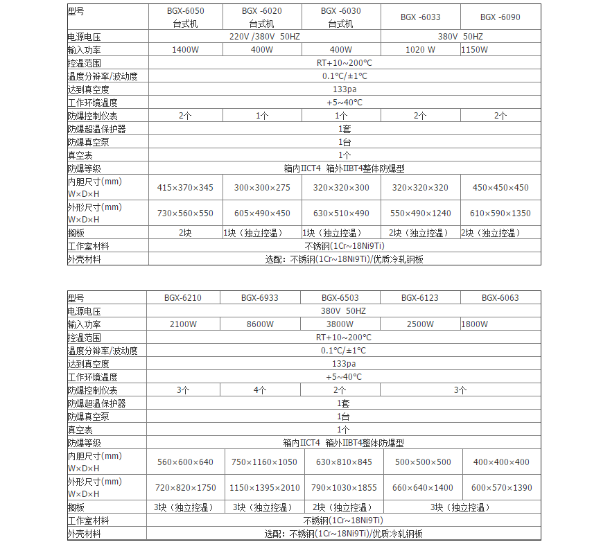 BGX防爆真空干燥箱系列采用304不銹鋼作為工作箱材料。用優質冷軋鋼板或304不銹鋼作為外殼材料。
